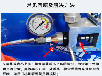 1、如機器無壓力或不出漿時,先檢查高壓灌注槍前端牛油頭內(nèi)的密封墊是否變形。如已變形,需換新的密封墊(因機器工作壓力大,密封墊需經(jīng)常更換)。
